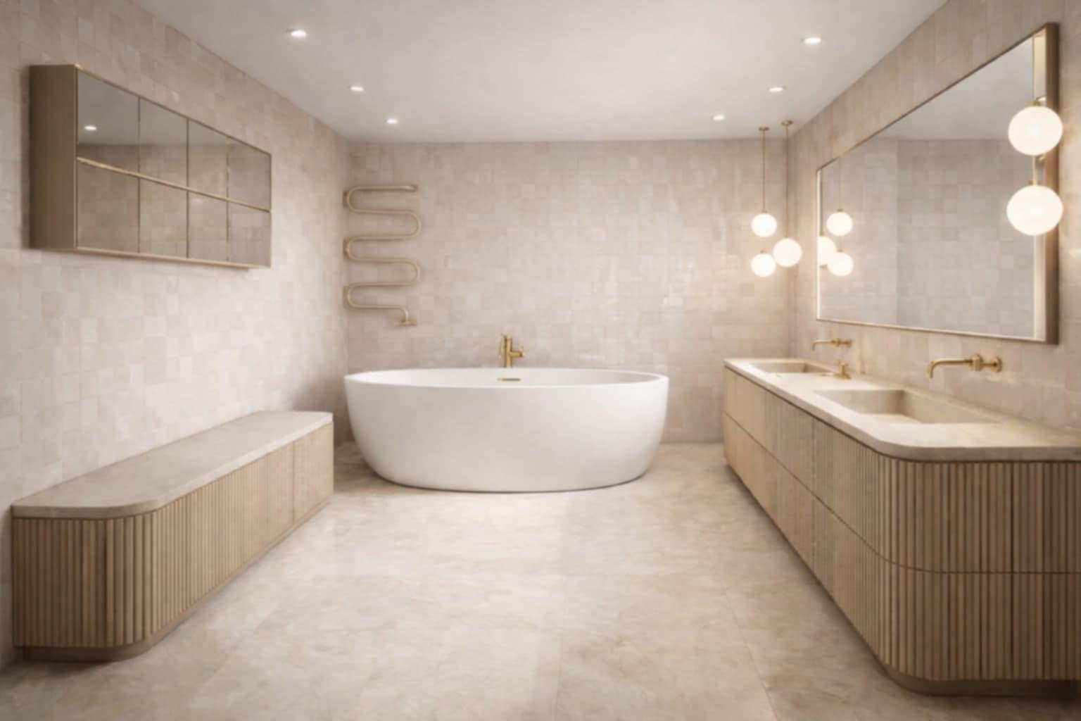 Cette salle de bain contemporaine allie élégance et sérénité avec une baignoire îlot blanche centrale aux courbes organiques. Un espace luxueux et fonctionnel pour un bien-être quotidien raffiné.