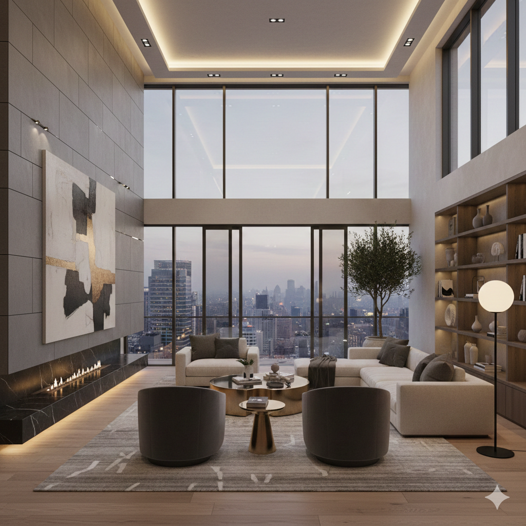 Ce projet incarne l’alliance parfaite entre monumentalité architecturale et confort intimiste. Tirant parti d’une double hauteur sous plafond spectaculaire, l’espace est baigné de lumière naturelle et offre une vue panoramique imprenable sur la ville. Le dialogue entre les matériaux bruts comme le parement mural minéral gris et la chaleur du bois